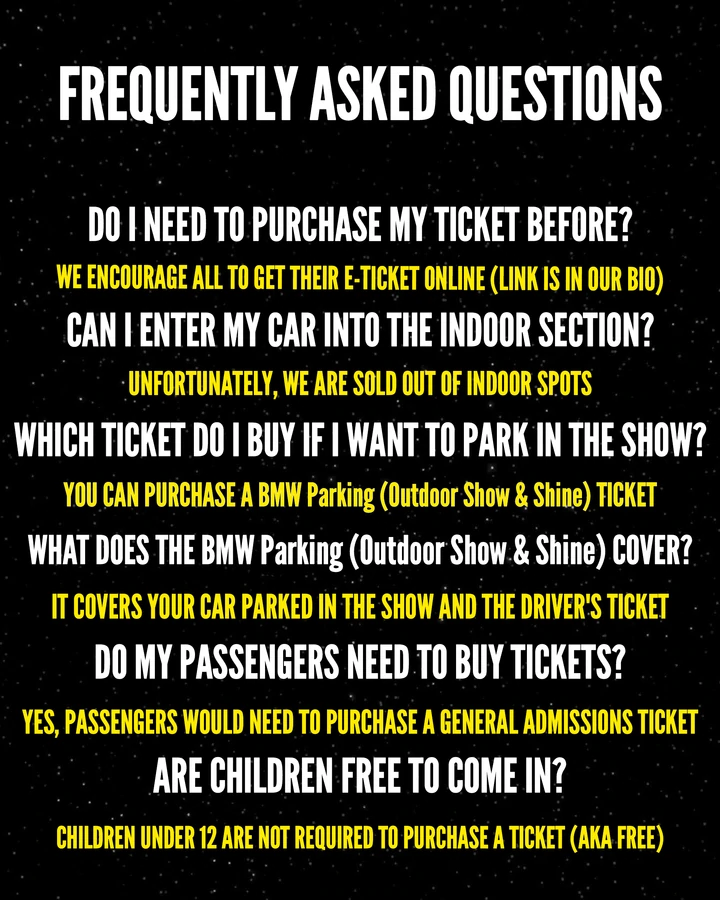 🟪 Lot 2 Is open to all BMWs. You do not need approval to purchase this ticket. You are part of the event. Allows you to participate in the exhaust competition & burnout competition. You will still be judged at this lot for the show. Social media coverage will be in this section.